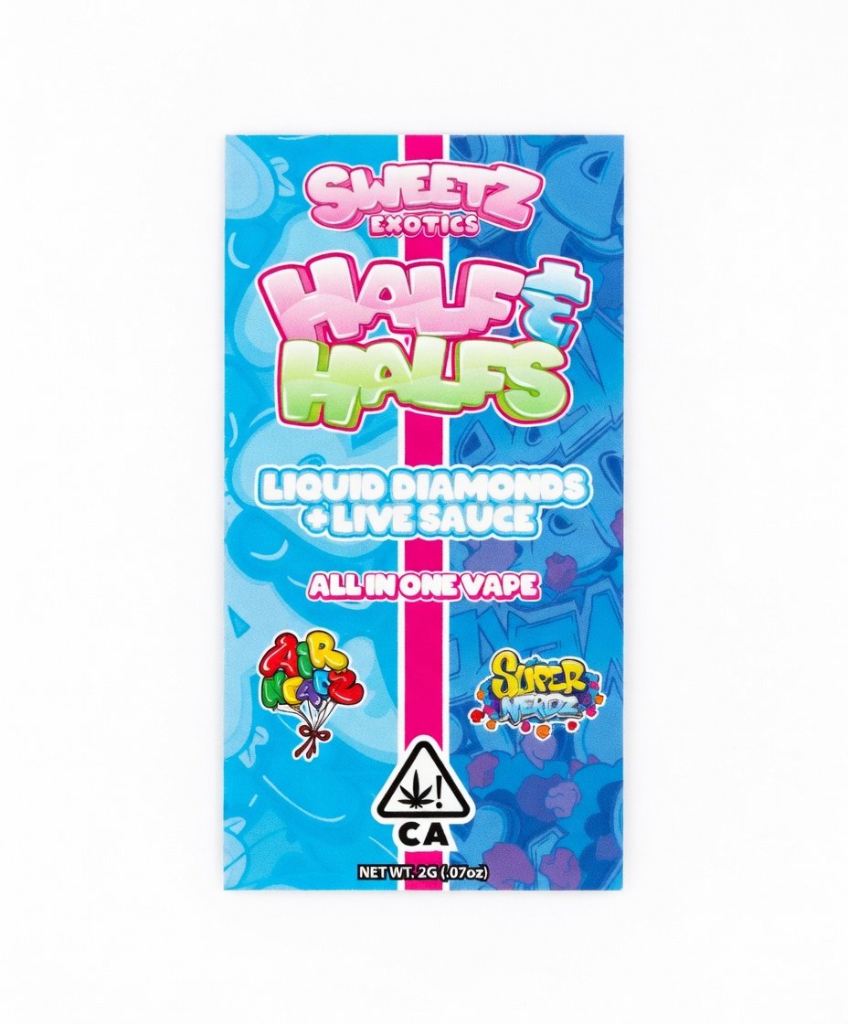 The sweetz exotics half and halfs line is a dual-flavor disposable vape system crafted to deliver a balanced blend of two complementary terpene profiles. In this edition, the Airheadz x Super Nerdz flavor combines tangy, fruity bursts with sweet candy undertones, similar to strains like blue candy zours strain and trap candy.